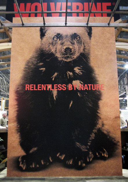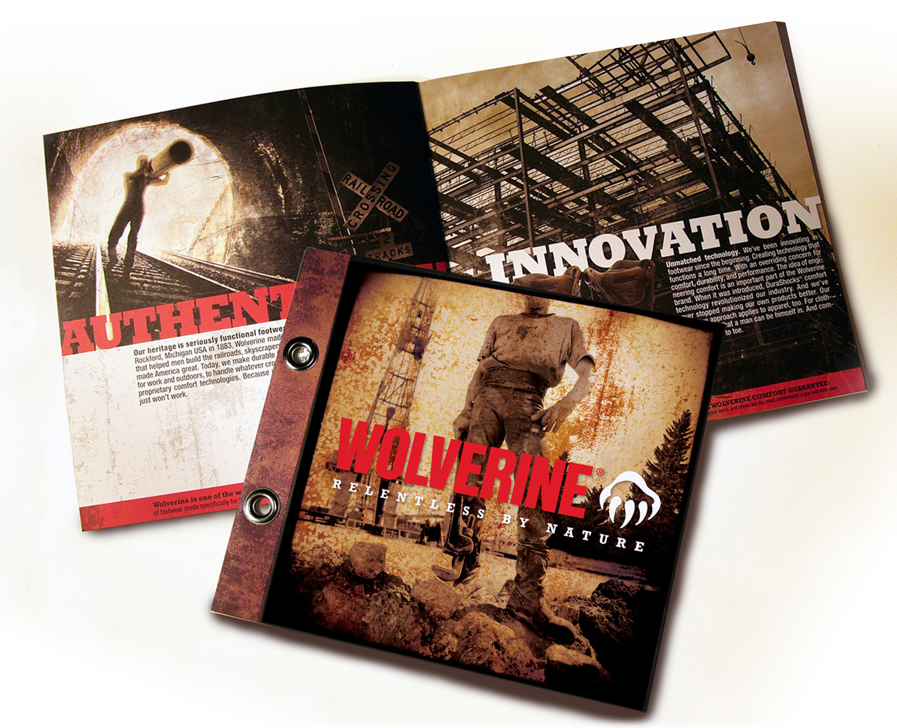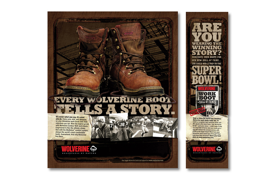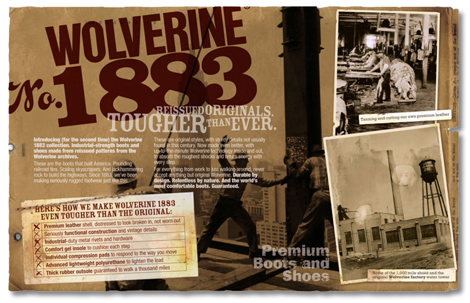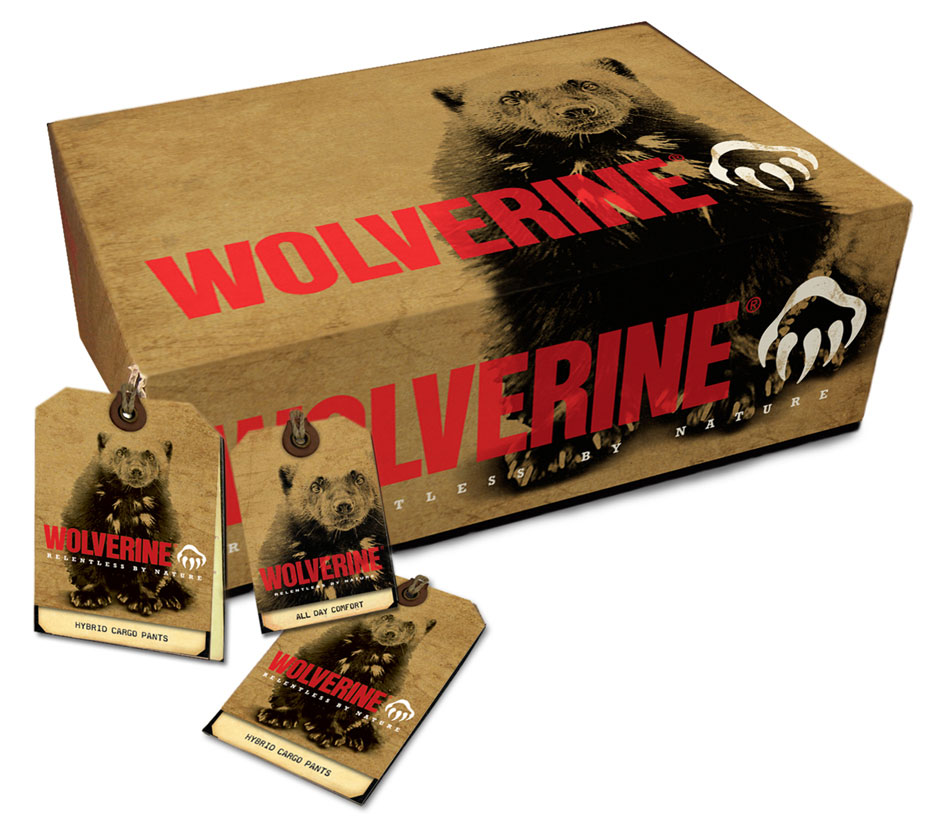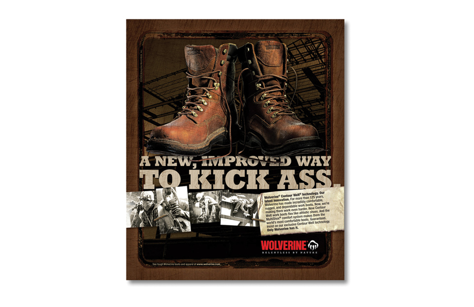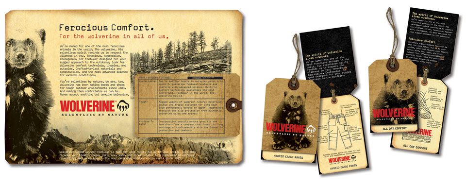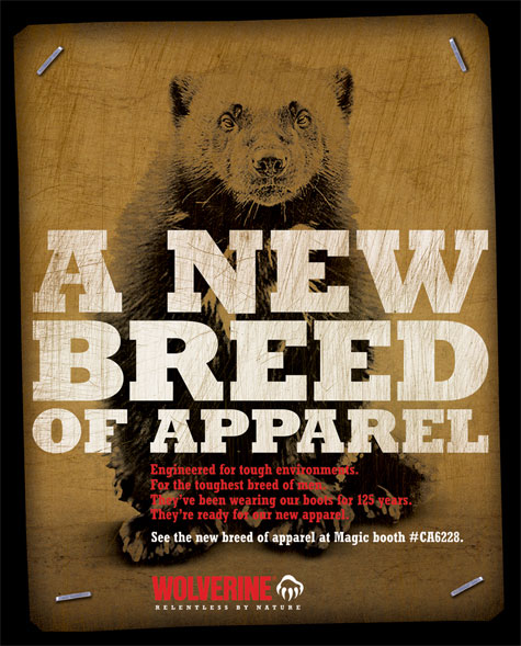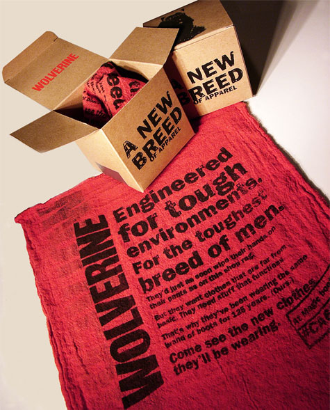 Apparel awareness campaign: Print ad helps retail buyers connect the tough new apparel line to the brand. Dimensional mailer was printed on a shop rag… because the Wolverine consumer would as soon wipe his hands on his pants as the rag.