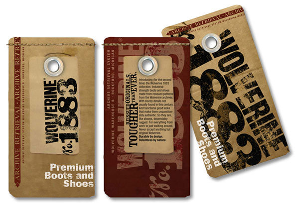 1883 tags: “Archive retrieval” tags look like original warehouse issue. Modern touches, like the white type, bring the new brand into the present.