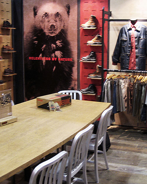 Showroom workspace: An efficient fixture system and brand-right tables and chairs. Background graphics tell the story without intruding. This space works!